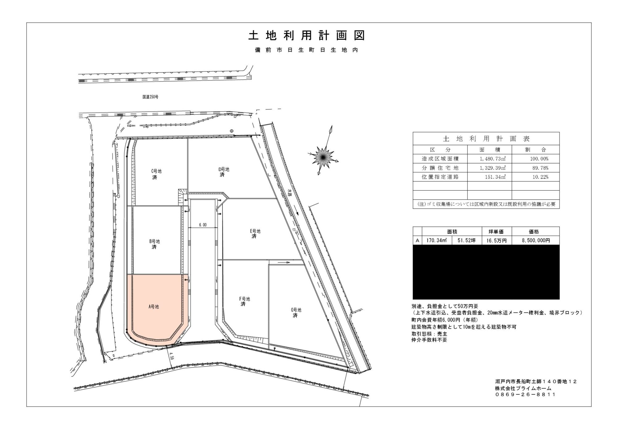 | 備考 | ・全7区画の分譲地 ・上下水道引込・境界ブロック・水道メーター20㎜権利合わせて負担金500,000円要 ・全区画建築条件無 ・建築物高さ制限として10mを超える建築物不可 |